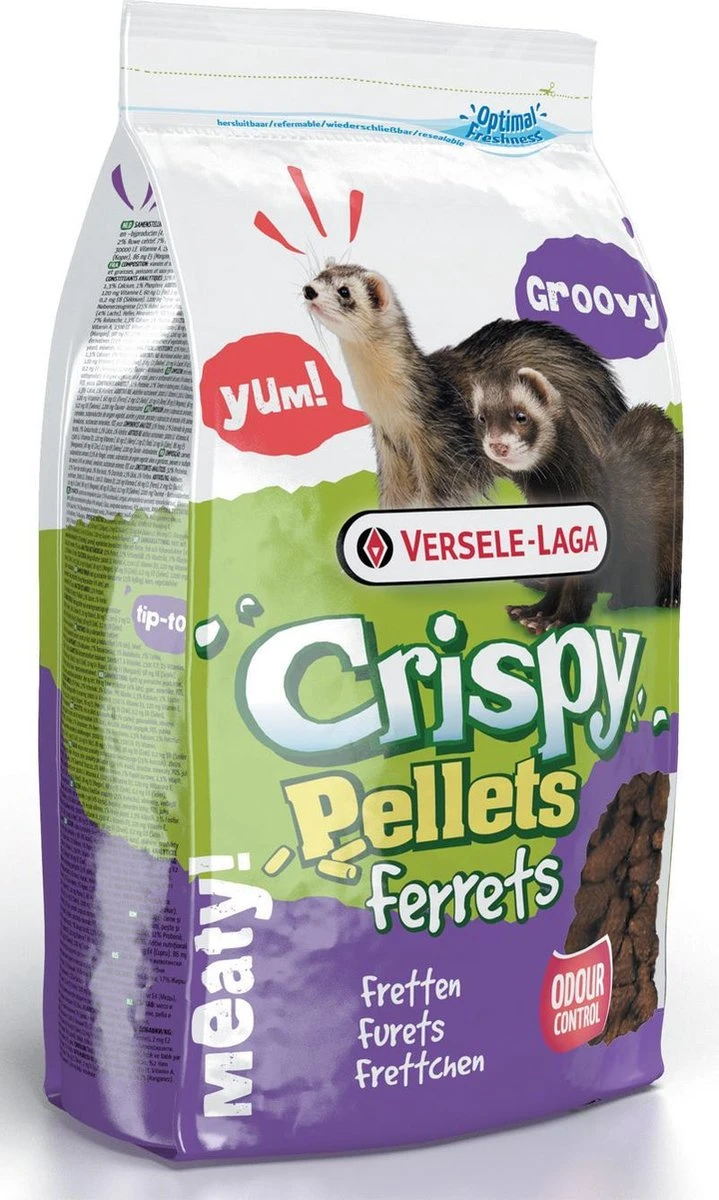 Volledige korrelvoeding voor fretten. Met veel dierlijke eiwitten en vetten, zalm en heerlijke kip. Bevat dankzij de “Happy & Healthy Mix”-korrels alle nodige voedingsstoffen.