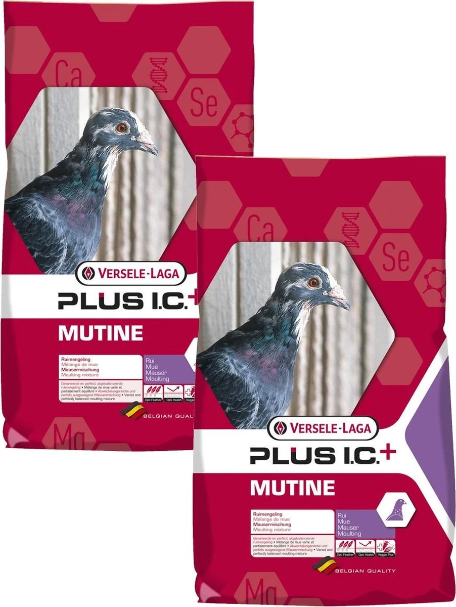 Volledig duivenvoer verrijkt met de speciale Immunity Concept+ ruikorrel. Mutine Plus I.C.+ is een zeer gevarieerde, wetenschappelijk uitgebalanceerde ruimengeling, die een perfecte pluimenwisseling garandeert.br /Analytische bestanddelenRuw eiwit 16.5%, Ruw vet 6.5%, Ruwe celstof 5.5%, Ruwe as 3%, Koolhydraten 56%, Calcium 0.18%, Fosfor 0.38%, Natrium 0.03%, Lysine 0.85%, Methionine 0.34%, Cystine 0.28%, Threonine 0.59%, Tryptofaan 0.18% br /Alle Plus I.C.+ mengelingen bevatten bovendien volgende vitaminen en sporenelementen: Vitaminen: A, D3, E, K3, B1, B2, B3, B12, C, PP, foliumzuur, biotine, cholinechloride. Mineralen en sporenelementen: calcium, fosfor, magnesium, natrium, ijzer, mangaan, zink, koper, kobalt, selenium. br /SamenstellingPlata maïs 4%, Rode maïs 4%, Franse cribs maïs 4%, Kleine Franse cribs maïs 4%, Getoaste sojabonen 6%, Dun peas 8%, gele erwten 3%, Grote groene erwten 2%, Kleine groene erwten 10%, Vitsen 3%, Katjang Idjoe 1%, Witte duiventarwe 17%, Soedanese witte dari 5%, Rode dari 5%, Cardy 3%, Witte duivengerst 3%, Paddy rijst 2%, Kleine gestreepte zonnebloempitten 1%, Kempzaad 2%, Bruin lijnzaad 2%, Raapzaad 1%, Zwart koolzaad 1%, Wilde zaden 1%, Ruikorrel I.C.+ 8% br /Inhoud: 20 kg