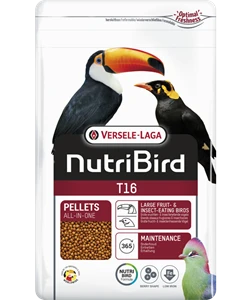 Geëxtrudeerde pellets – onderhoudsvoer voor grote vruchten- en insectenetende vogelsWetenschappelijk verantwoorde samenstelling voor o.a. beo’s, toekans, toerako’s en fruitduiven. Bevat alle nutriënten die jouw vogels nodig hebben. Volledig opneembaar, voorkomt selectief eetgedrag.- Met vruchten. Ondersteunt de darmflora en behoedt tegen darmstoornissen.- Een veel voorkomend probleem bij fruit- en insectenetende vogels is ijzeropstapeling in de lever; daarom heeft NutriBird T16 een zeer laag ijzergehalte (max 85 ppm).- Aanbevolen door dierenartsen en wereldwijd gebruikt door vogelparken en topkwekers.OPTI DIGESTMet natuurlijke kleimineralen en prebiotica voor een gezonde darmflora en optimale vertering.OPTI FEATHERBevat alle voedingsstoffen voor een prachtig verenkleed.OPTI CALCIUMDe optimale calcium-fosforverhouding voor een gezond beendergestel.SAMENSTELLINGgranen, plantaardige eiwitextracten, zaden, oliën en vetten, suikers, mineralen, vruchten (appel 7%*, veenbes 2%*, vlierbes 1%*), MOS, gist, yucca*gedehydreerd fruit & groenten, % equivalent voor drogenANALYTISCHE BESTANDDELENeiwit 16%, vetgehalte 7,5%, ruwe celstof 3%, ruwe as 4,5%, calcium 0,8%, fosfor 0,55%, methionine 0,3%, lysine 0,8%, threonine 0,55%, tryptofaan 0,2%, cystine 0,3%TOEVOEGINGSMIDDELEN/KGNUTRITIONELE TOEVOEGINGSMIDDELENvitamine A 8650 IE, ß-caroteen 5,2 mg, vitamine D3 1800 IE, vitamine E 100 mg, vitamine B1 8,5 mg, vitamine B2 19 mg, calcium-D-pantothenaat 24 mg, vitamine B6 7 mg, vitamine B12 0,04 mg, vitamine C 60 mg, niacine 95 mg, foliumzuur 1,8 mg, biotine 0,31 mg, cholinechloride 840 mg, tanninezuur 0,125%, 3b202 (jodium) 2,5 mg, 3b405 (koper) 12 mg, 3b503 (mangaan) 120 mg, 3b605 (zink) 115 mg, 3b802 (selenium) 0,12 mg, 3b811 (organisch selenium) 0,12 mgTECHNOLOGISCHE ADDITIEVENantioxidanten: met tocoferolen, conserveermiddelenSENSORIËLE TOEVOEGINGSMIDDELENkleurstoffenGEBRUIKSAANWIJZINGNaar believen verstrekken, in combinatie met vers fruit en/of levend voer. Eventueel kort inweken in zuiver water.